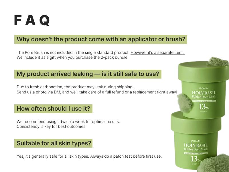 ✨ Product Overview ✨ The P.CALM Holy Basil Bubble Deep Mask harnesses Holy Basil & Carbonated Water for effective pore cleansing and blackhead removal. This Korean Clay to Bubble Wash-Off Pack weighs 90g/3.17 oz. It includes extra space for carbonation, ensuring stability and effectiveness. Each jar contains the full 90g as labeled. Perfect for maintaining clear pores and skin health. • Why isn’t it full? The packaging has extra space for carbonation. Rest assured, each jar contains the full 90g. No need to worry about missing out on product. • How often should I use it? We recommend using it twice a week for optimal results. Consistency is key for best outcomes. • Suitable for all skin types? Yes, it's generally safe for all skin types. Always do a patch test before first use. • Why doesn't the product come with an applicator or brush? The brush is not included in the single item, as it is a separate item. Contact us for further assistance.If you ordered a set that includes the brush but didn’t receive it, please note that your order may arrive in two separate shipments. Feel free to contact us if you need any help—we’re happy to assist! • My product arrived leaking — is it still safe to use? Due to fresh carbonation, the product may leak during shipping. Send us a photo via DM, and we’ll take care of a full refund or a replacement right away!